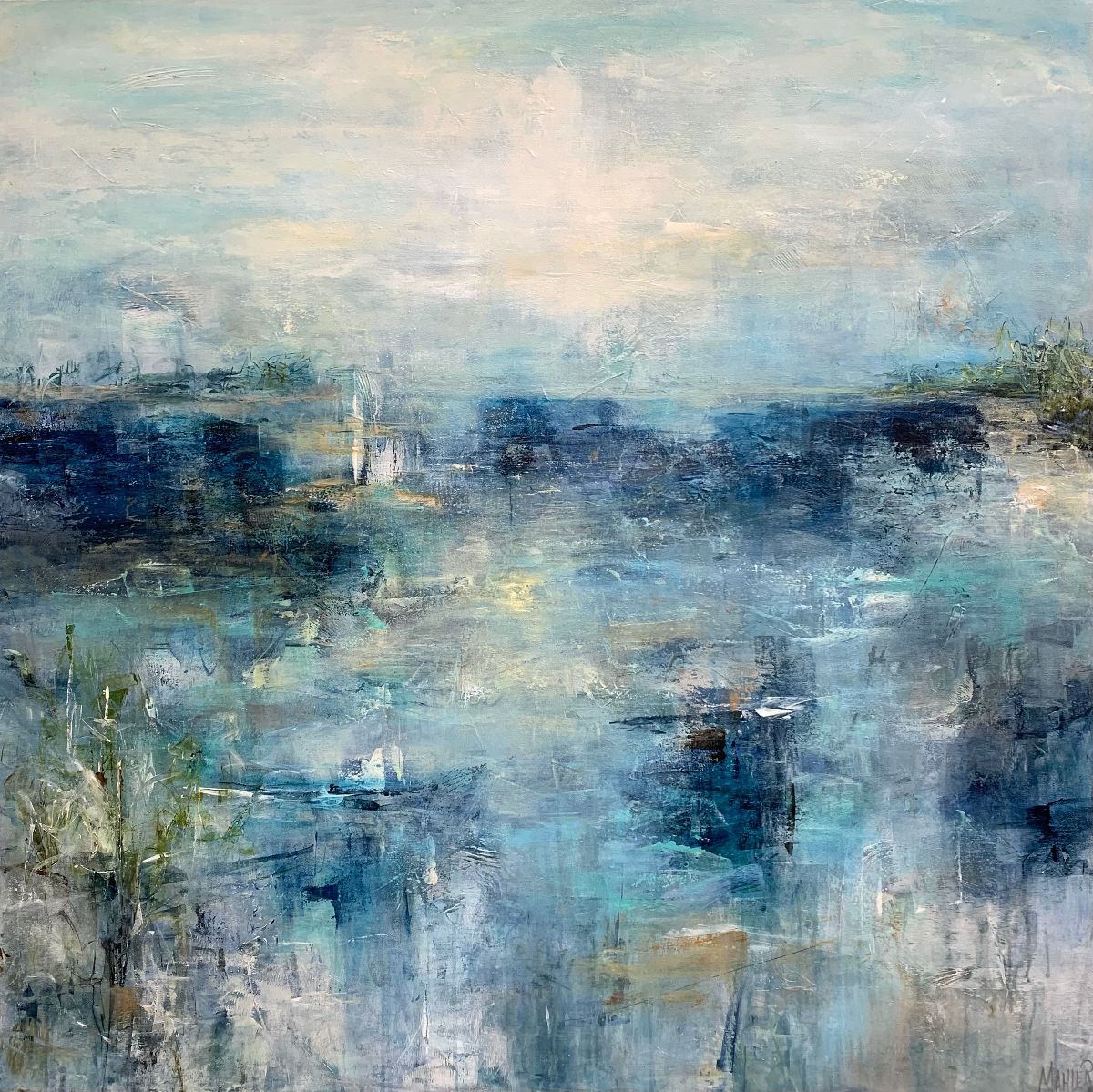 48x48 Original Abstract Mixed Media Soothing water scene capturing blues of every color. Touches of green elements with some interesting soft areas of texture to enhance the curious mind.