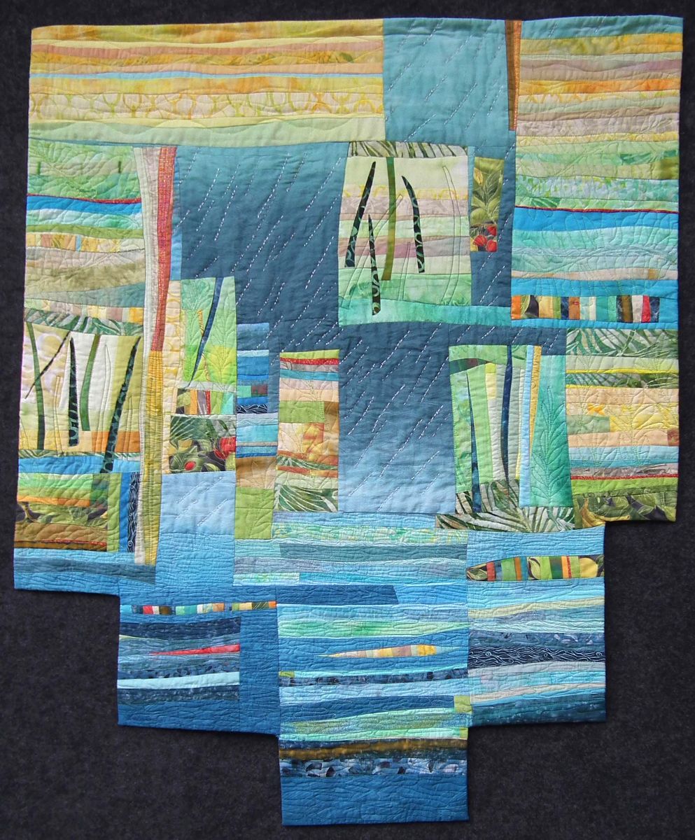 Improvisational art quilt depicting fast moving afternoon downpours typical of south Florida summer weather.