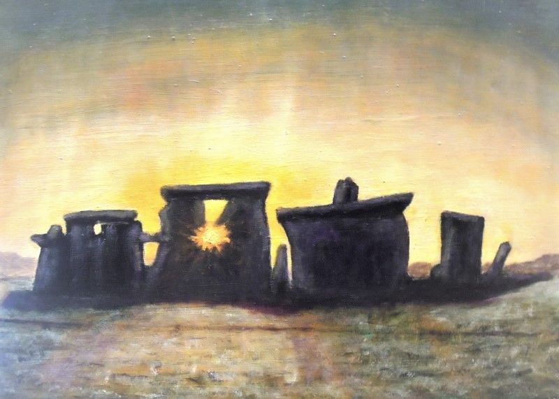 OIL ON CANVAS DEPICTION OF THE WINTER SOLSTICE AT STONEHENGE ENGLAND CAPTURES THE SPECTACULAR SUNSETS AT THE HISTORIC STONEHENGE SITE.
