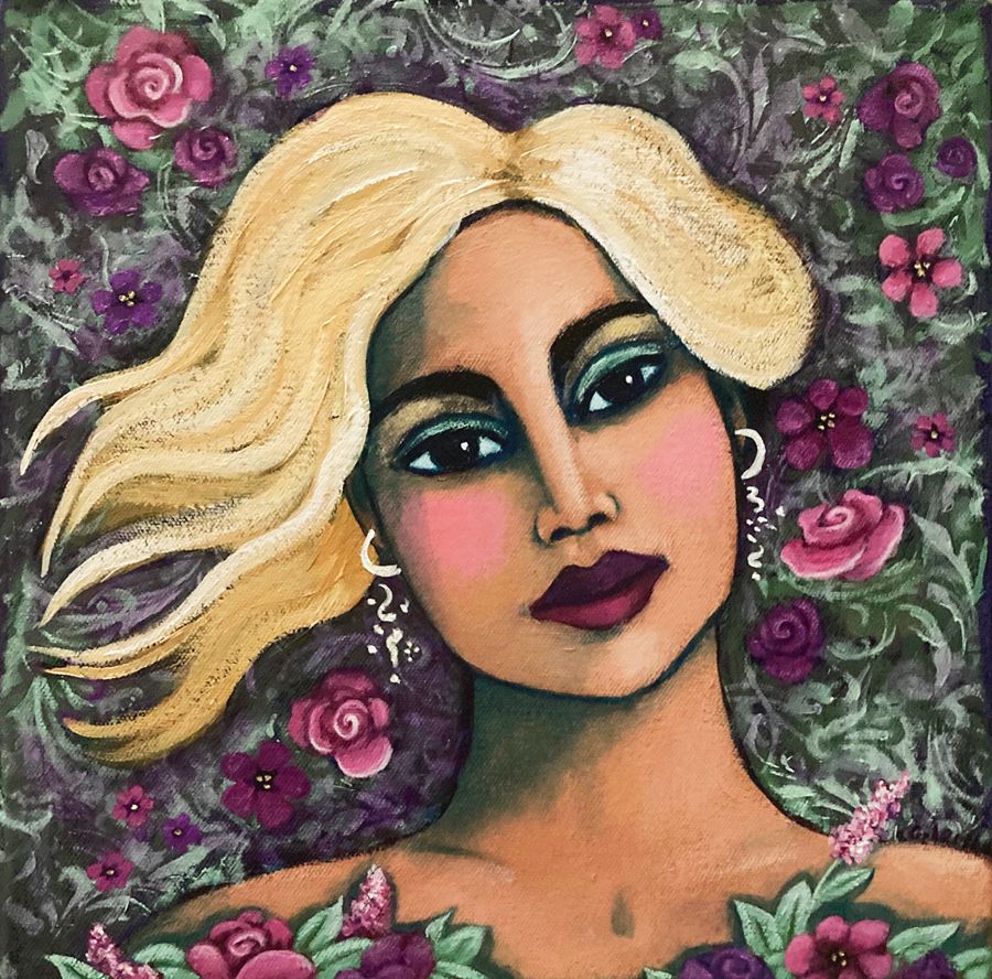 A woman looks directly at the viewer. She is surrounded by flowers and her blond hair flows. She is lovely and strong. She has made a choice