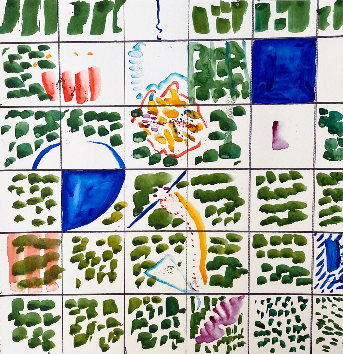 Watercolor and ink on paper 12" x 12"Drawing where grids done in Sharpie pen contain and organize gestural marks and forms.