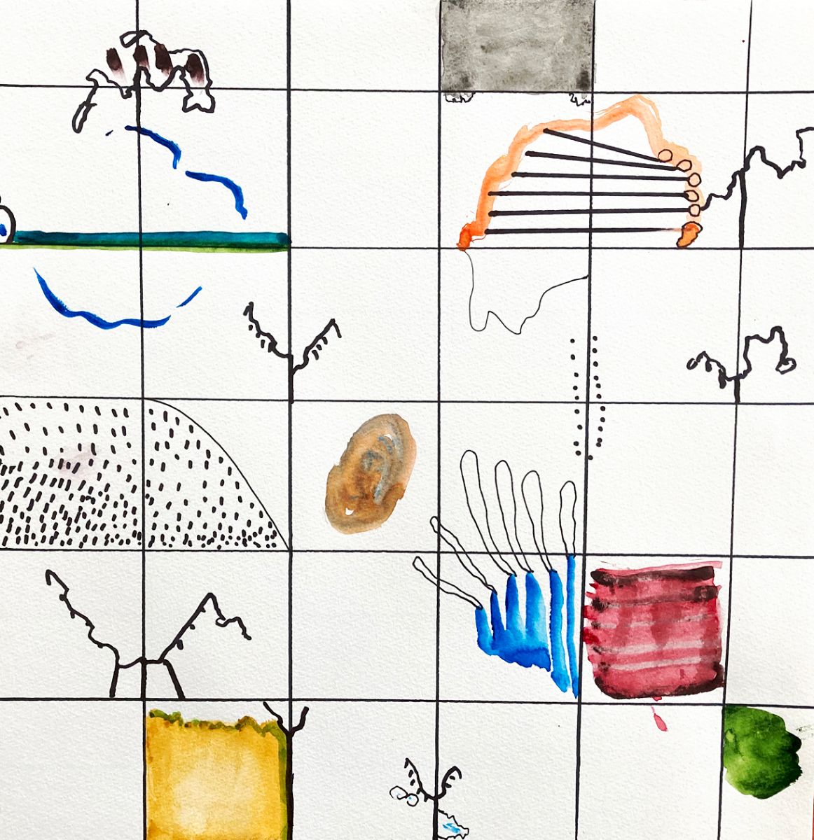 Drawing where grids done in Sharpie pen contain and organize gestural marks and forms.