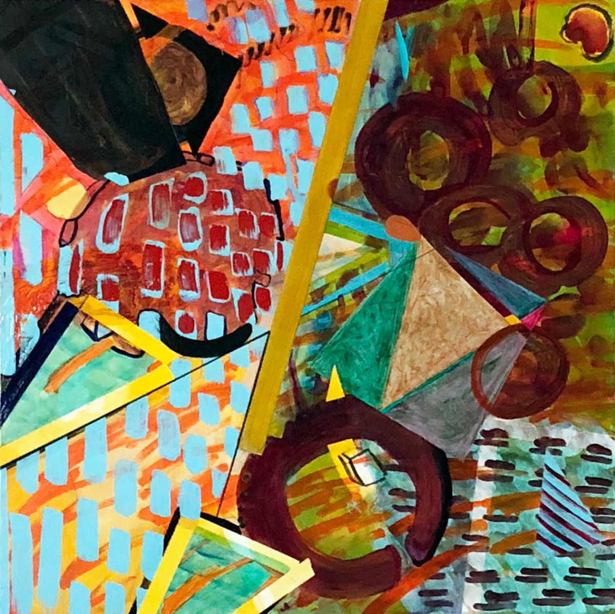 The geometric elements contain and organize gestural marks and forms that elicit individual responses from the viewer.