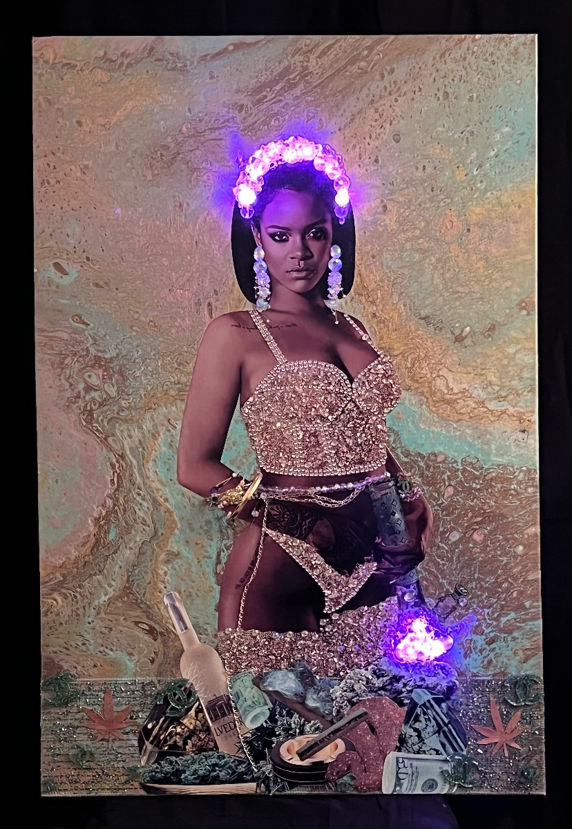 Acrylic, glass, crystal, metal, LED, resin on canvas with collage