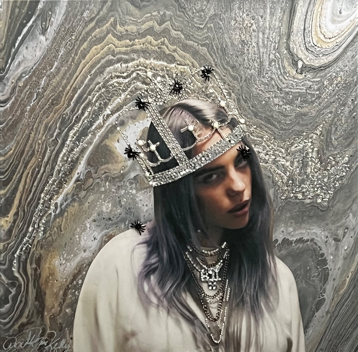 Spider-crown Eilish | Mixed media resin on canvas, 20" x 20" x 3"