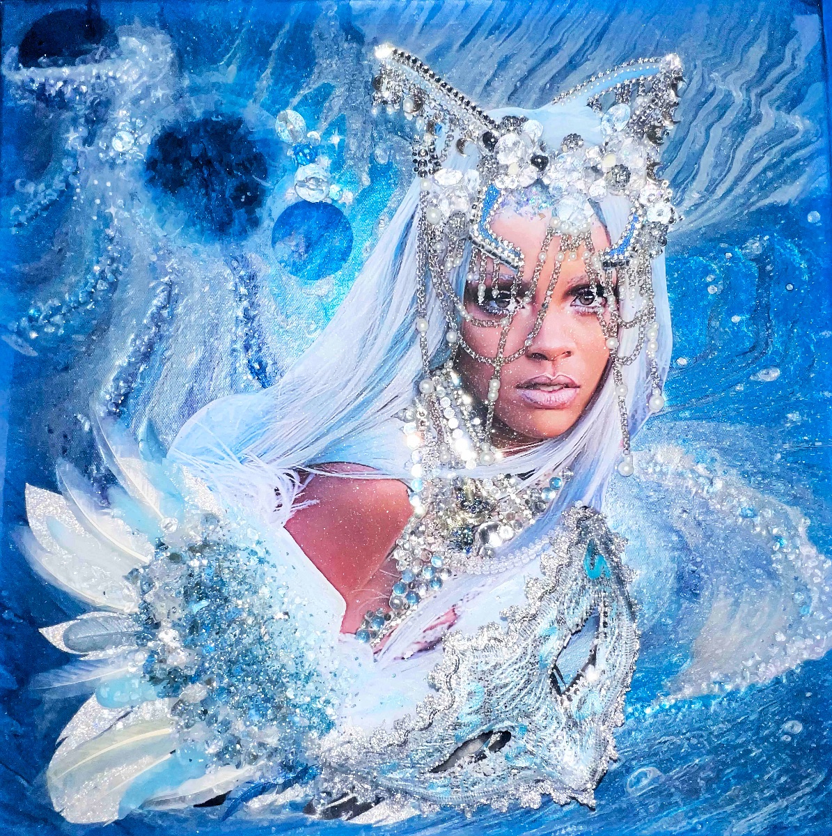 Space Bird Mother | Mixed media resin on canvas, 20" x 20" x 2"