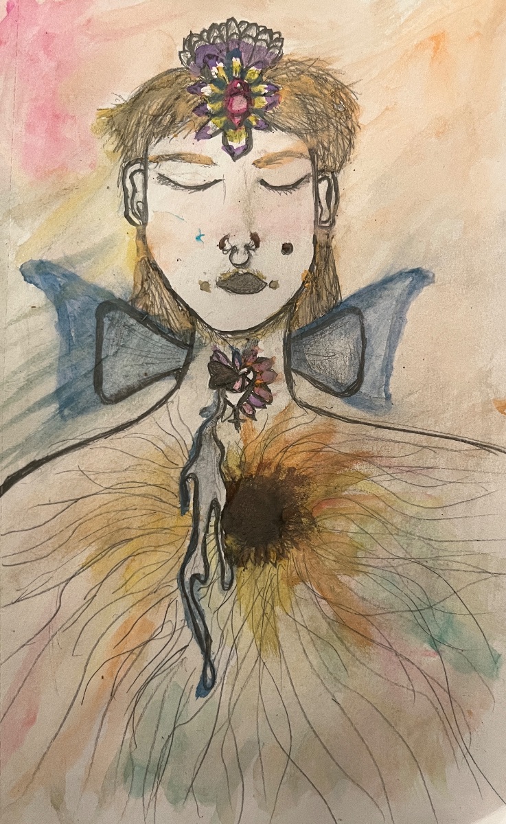 This is a very special self-portrait created by the artist to depict the impact of a chakra opening exercise. They discovered that the flower representing their throat chakra during the meditation was having difficulty opening (in fact so much so that some of the petals remained in their casings even when the flower had mostly opened). They ended up tearing up unexpectedly heavily as a result. The sunflower at the heart is a reference to the love that shines from the human soul, as well as a reference to Ginsberg's poem "Sunflower Sutra" in which a battered sunflower still with "strength to shine" represents resilience of the spirit. The butterfly wings signify not only the butterfly-shaped thyroid gland, with which the artist has had lifelong issues, but also change and uniqueness.