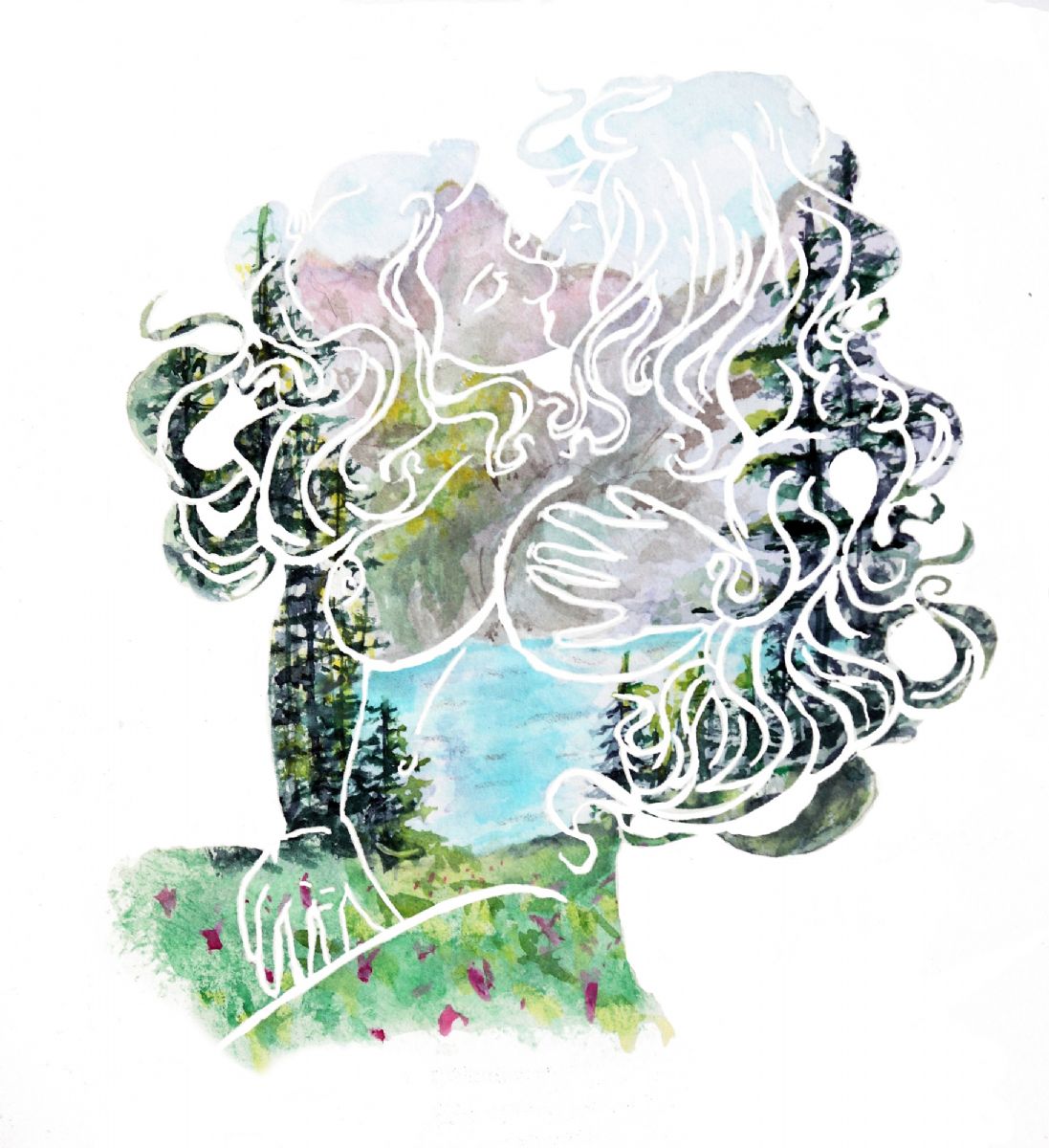 They Found Each Other at Jade Lake is part of a series entitled PNW Lovers. Inspired by the breathtaking scenery of Washington State, this series of work embodies both a voracious passion for the Pacific Northwest and a celebration of impassioned love. Mountain ranges and skylines encompassed within, the figures in these paintings caress and embrace, connecting at once to each other and their natural surroundings that seems to be part of their very beings, an intrinsic aspect of their souls.