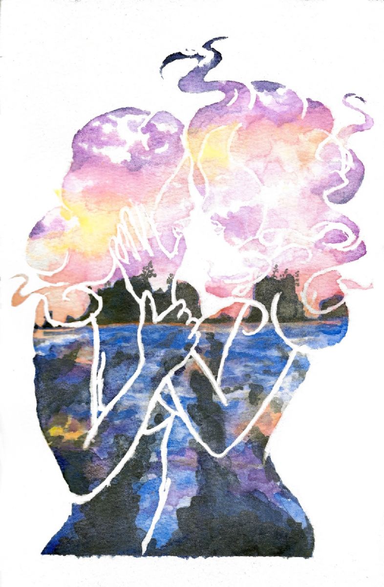 She She Sweethearts is part of a series entitled PNW Lovers. Inspired by the breathtaking scenery of Washington State, this series of work embodies both a voracious passion for the Pacific Northwest and a celebration of impassioned love. Mountain ranges and skylines encompassed within, the figures in these paintings caress and embrace, connecting at once to each other and their natural surroundings that seems to be part of their very beings, an intrinsic aspect of their souls.