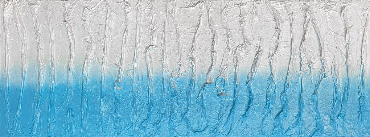 100 - Ocean Blue is the beginnings of a new series using paper, acrylics and mica on canvas. A sculptural piece with raised vertical lines of twisted and manipulated paper applied to canvas. Coated in mica shimmer to accent the light as it hits the raised paper.