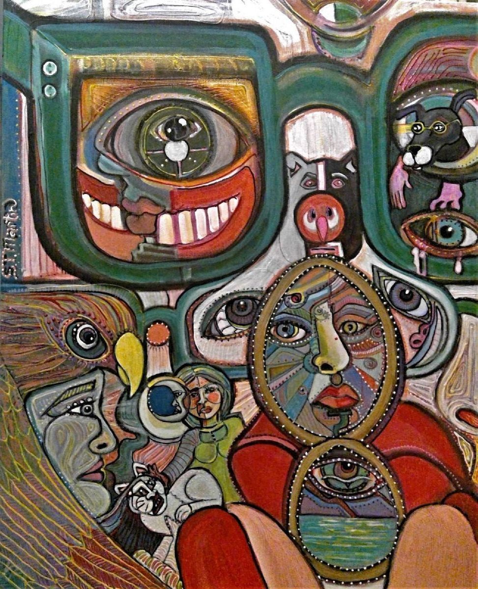 I created this piece as a Self Portrait, motivated by a desire to accept and love myself as I am. I have suffered from Body Dysmorphic Disorder as an adolescent and have to remind myself that I am perfect just the way I am. In this painting I illustrated some of the old thoughts in humorous ways to help show the absurdity of this damaging thought process. We are all perfectly imperfect.
