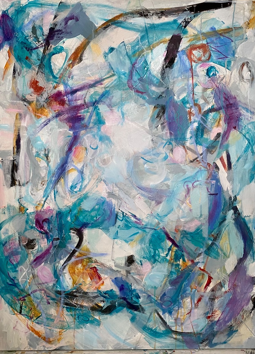 This work is part of a series called "Learning to Flow". Each piece has bright and muted colors. They contain Acrylic paint, graphite, charcoal, oil pastels, and pastels. These paintings were done after a long illness. This piece is 40x30 inches and 1.5 inches deep.