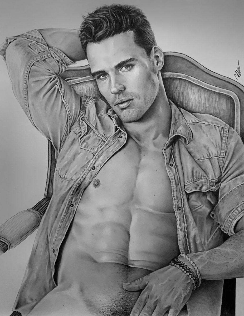 Because I only started drawing again three years ago, I'm continually trying to hone my craft, discovering my strengths and weaknesses, and uncovering new predilections along the way. One such predilection is drawing fabrics and materials, such as denim, leather and knits. I love the challenge of capturing their familiar textures with a pencil and paper. I also love juxtaposing these tactile materials against something smooth, such as human skin.