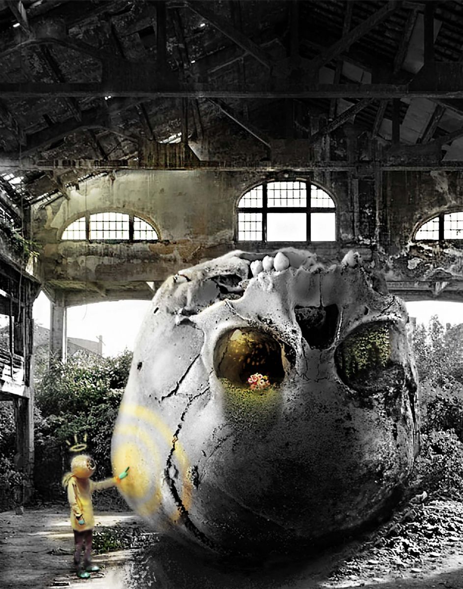 I used both digital collage and digital painting to produce this piece; I had to paint the lighting scenario by rendering the forms of the skull, ground, and surrounding environment. The figure is invented from imagination and digitally painted, as are the flowers, moss, and foliage in the eyesockets.