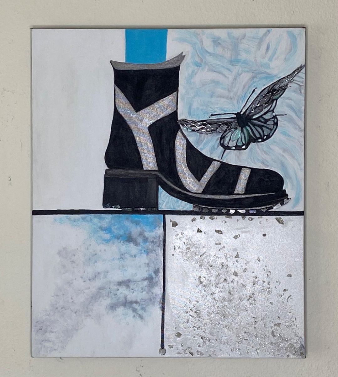 Walking pain free is a dream, a fantasy that I rewind in my mind. As I slip on my boots, and stand tall, suddenly I feel strong. I'm crushing it. Acrylic paints with recycled glass and metal.