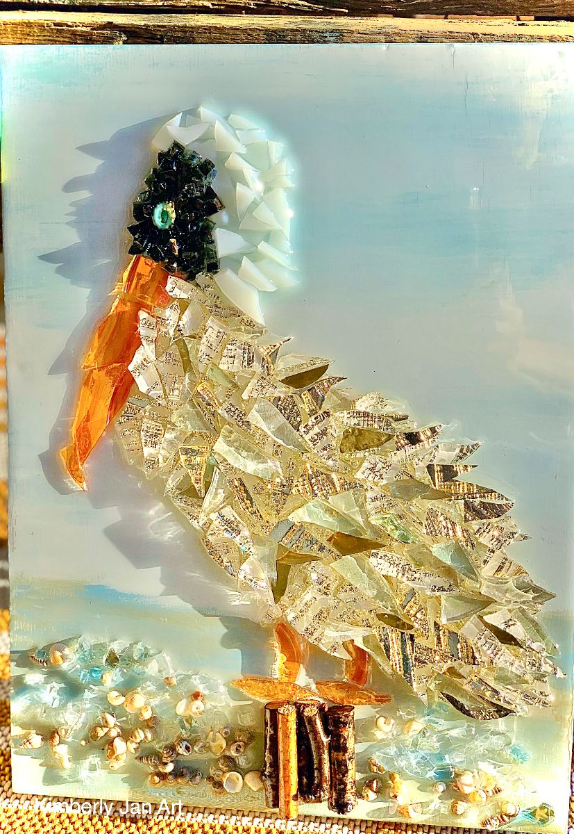 Glass and resin artist Kim Nashed created this piece using vintage glass, seashells, and wood.