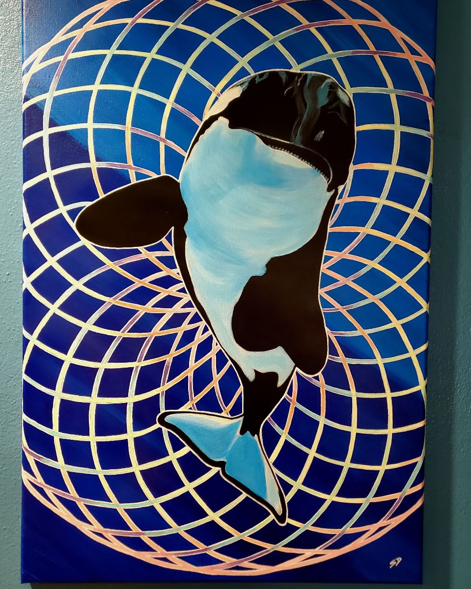 A curious orca whale dances in the foreground in front of a rainbow-colored geometric design with a dark blue background.