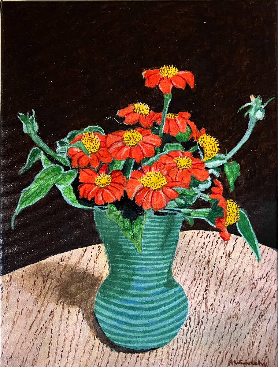 My sister-in-law posted a photo of her sunflowers in a vase. I surprised her with this 8" x 10" painting upon her visit to my house.