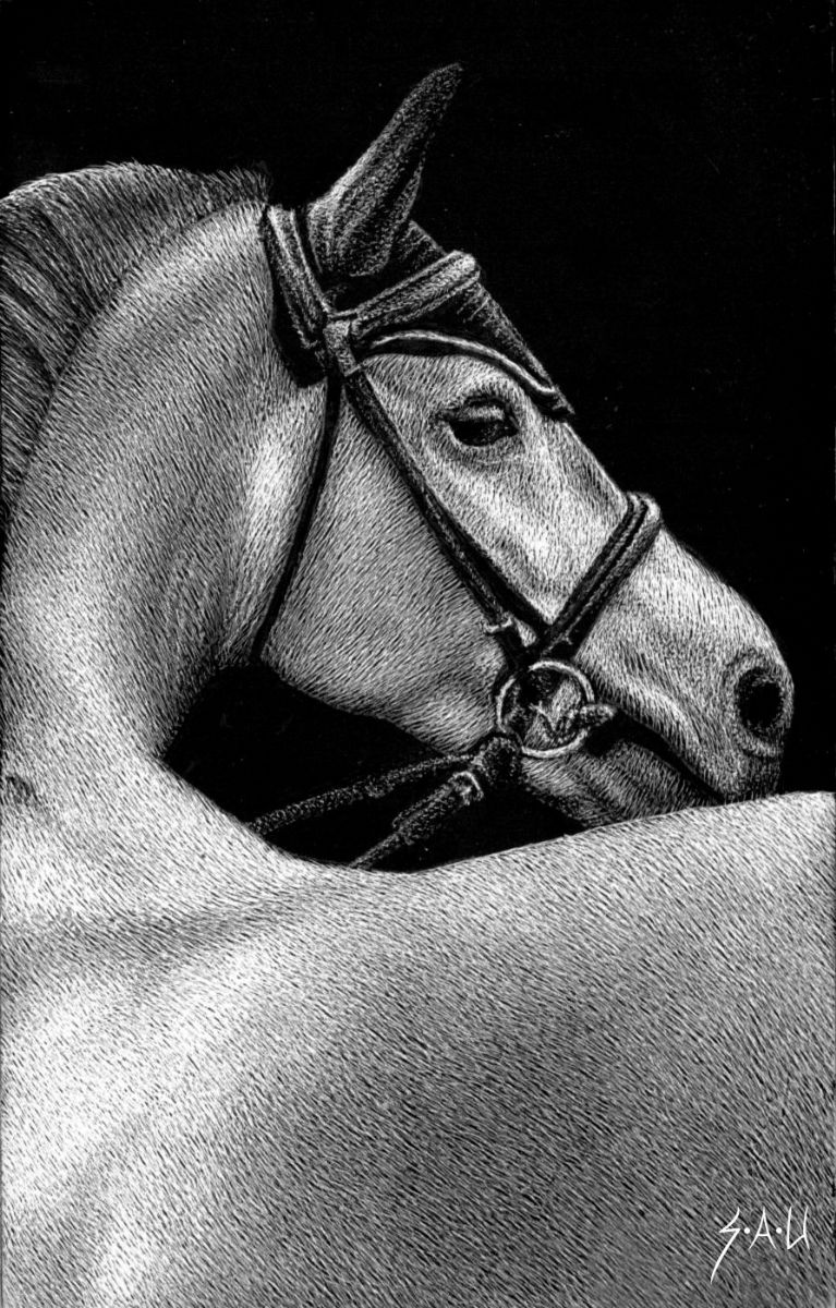 Scratchboard is a form of direct engraving where the artist scratches off dark ink to reveal a white layer of porcelain clay underneath. Scratchboard refers to both a fine-art medium, and an illustrative technique using sharp knives and tools for engraving into a thin layer of white China clay that is coated with dark, often black India ink. Scratchboard can be used to yield highly detailed, precise and evenly textured artwork. Works can be left black and white, or colored.