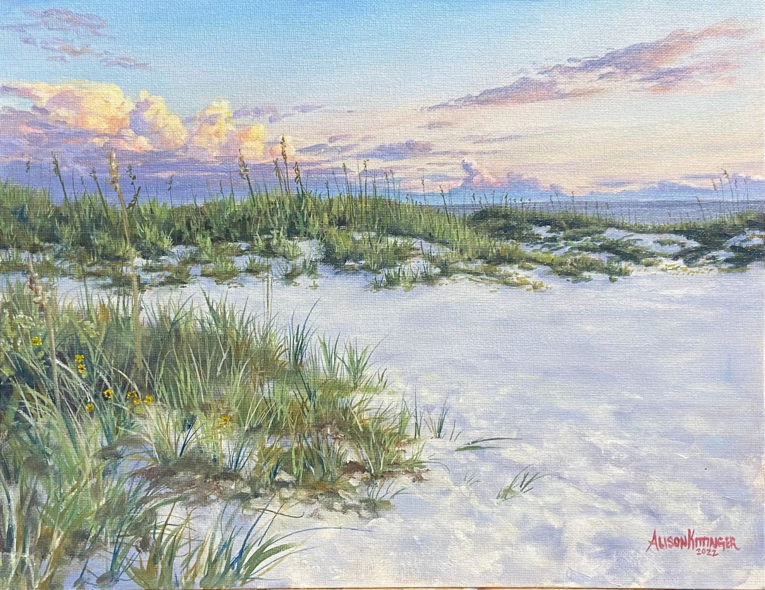 After setting this painting aside for almost a year, I came back to it and added multiple layers into the sky and refined the dunes. My favorite part is the slightly warm whites giving the effect of the last rays of sun touching the right sides of the dunes. Final touches included a small liner brush to create the blades of grass, oats and flowers.