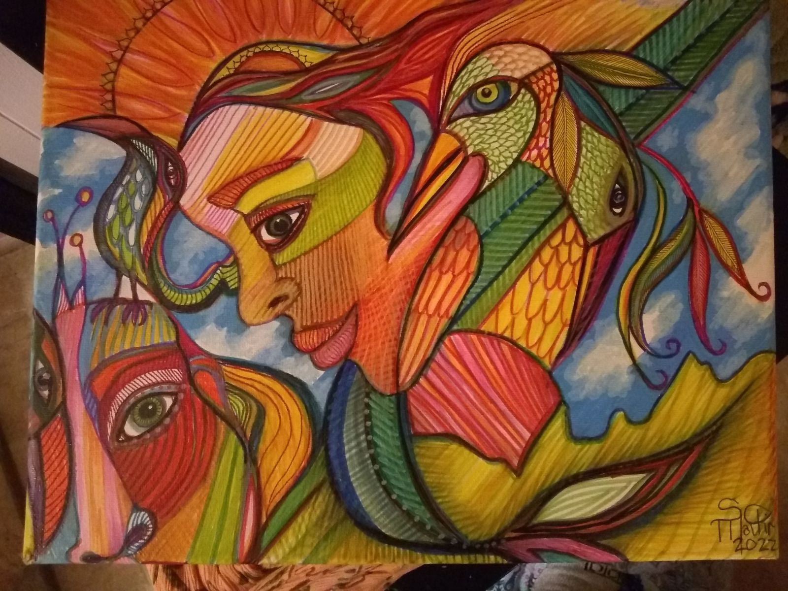 My imagination takes flight again in this piece. I often use birds and sky in my work, giving the sense of childlike freedom and optimism. The vibe is energetic and alive, but also dreamy. She looks up into the atmosphere where there are no boundaries and possibilities are "Limitless"!!