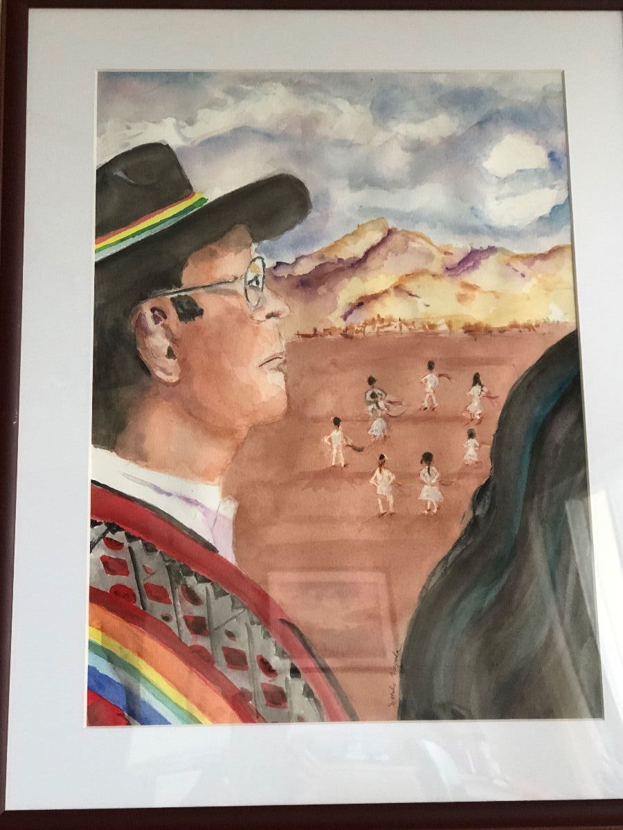 Watercolor of viewers admiring Native dancers during a cultural event in Cuzco, Peru Plaza.