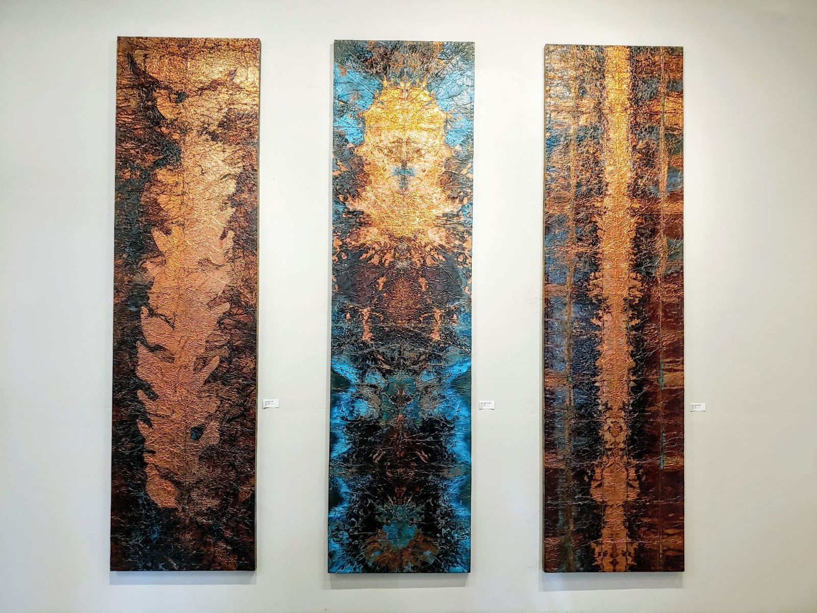 Fumed Copper: The technique employed to produce these pieces involves exposing a clean copper lamina to a chemical process that elicits the natural copper patina. The exposed areas will produce a patina, the shielded areas will retain the shine. The process is set and sealed to prevent further oxidation.