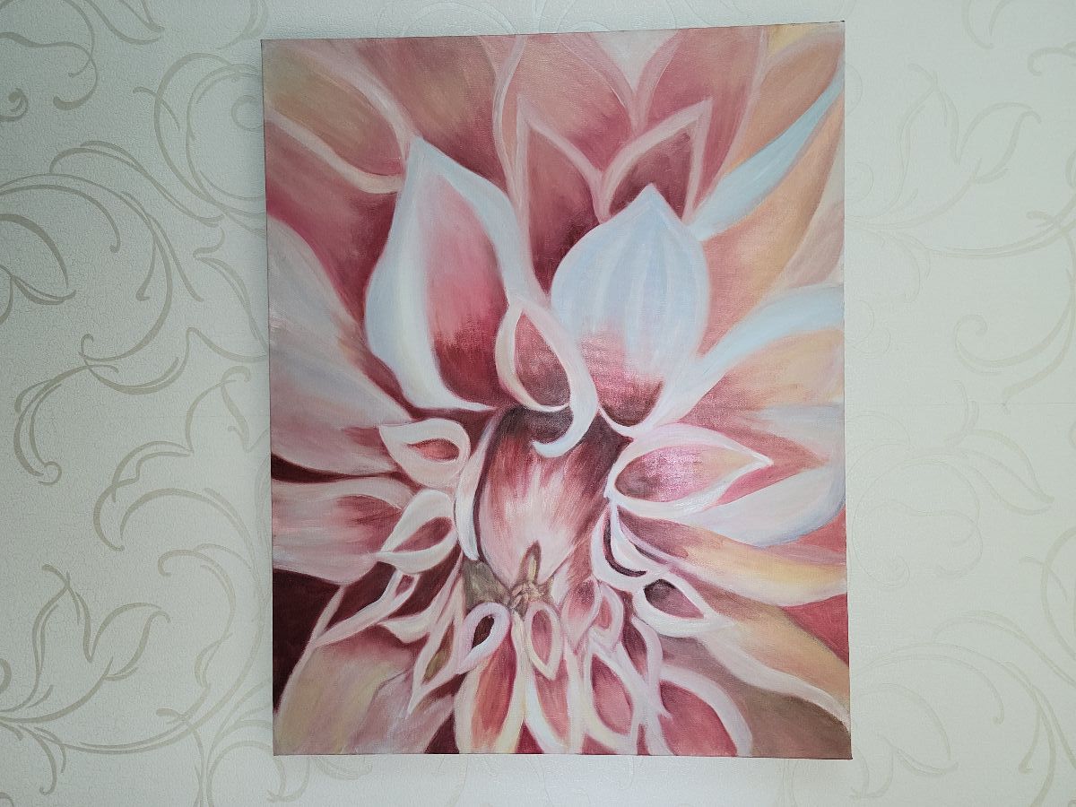 If you want to shoe your everlasting love and commitment, then the Caf"e Au Lait Dahlia is for you. The size is 24 x 30 painted in Oil, gallery wrap canvas.$1700.00