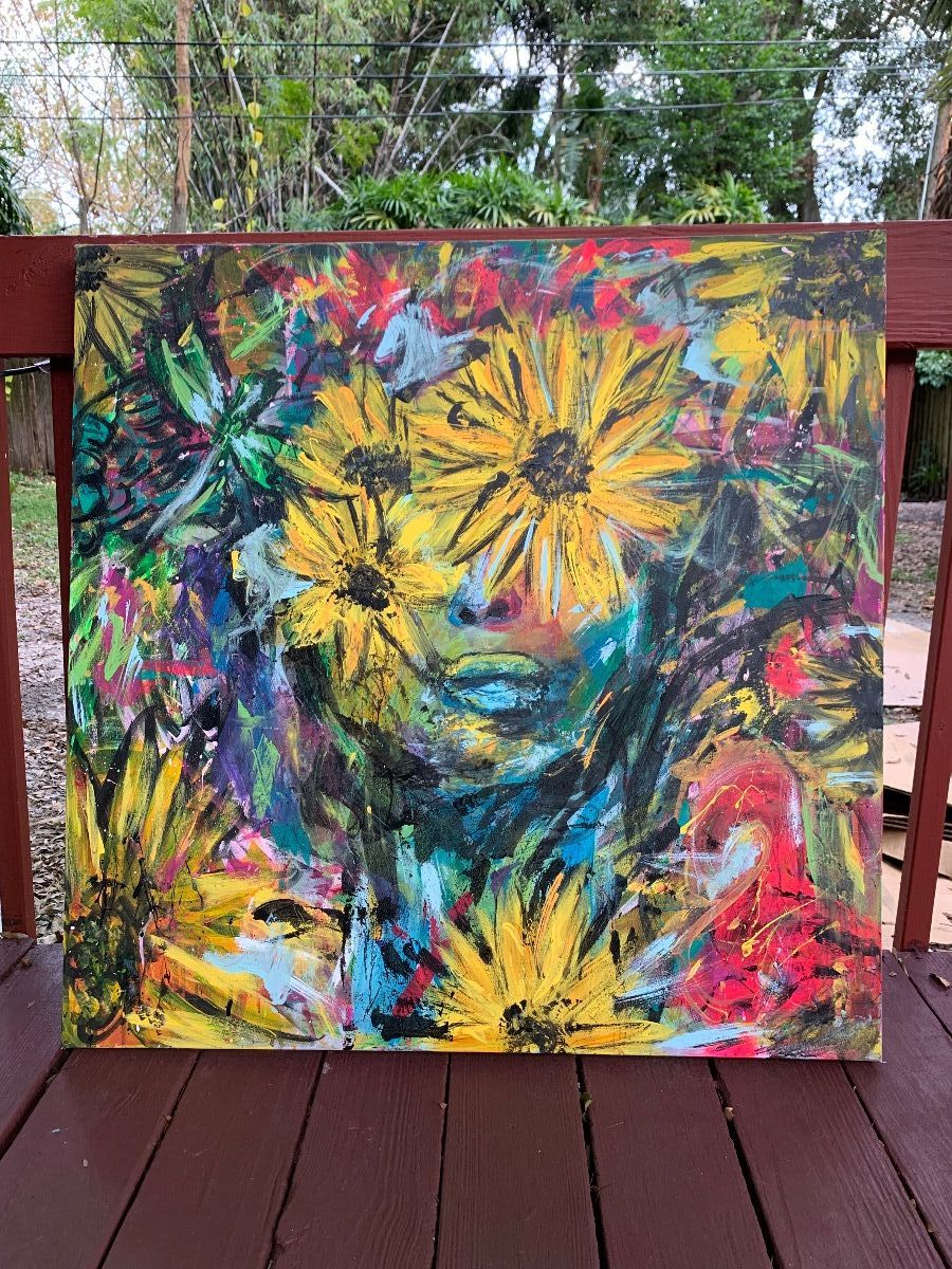 I wanted this painting to embrace the beautiful in the midst of chaos in life. Find the flowers and find your happy place.