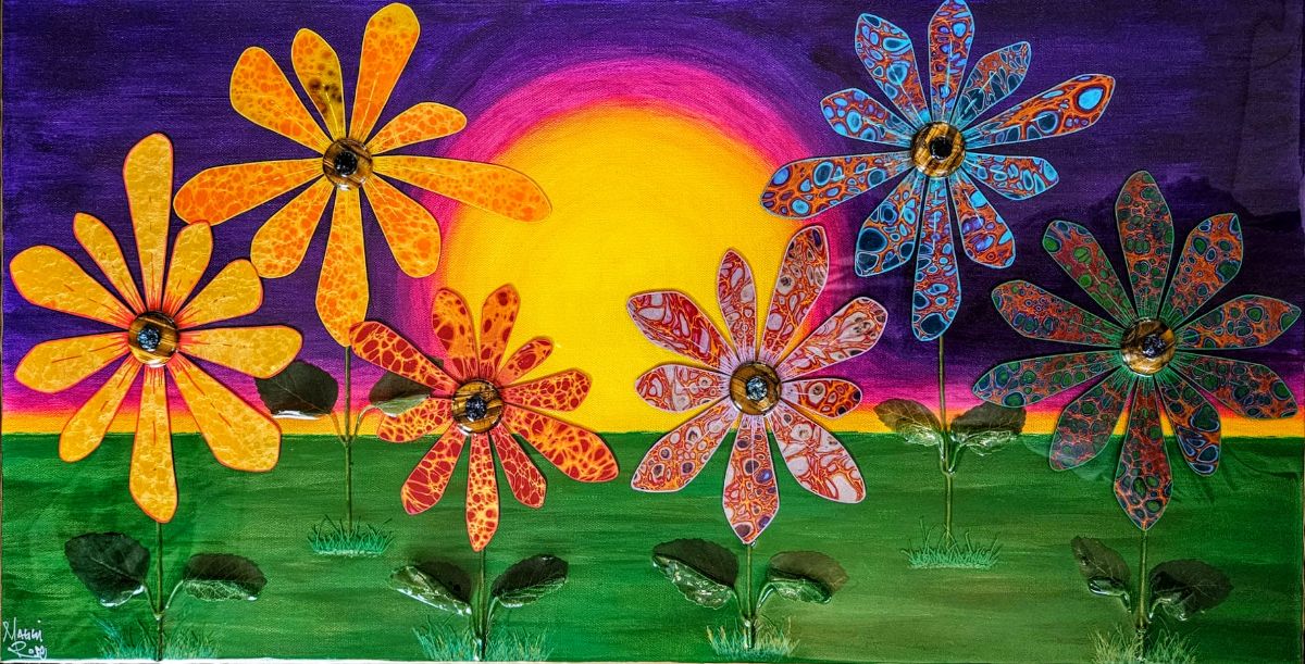 Each daisy is created using recycled paint skins and silk flower stems. Each flowers' center is Tigers Eye, which is a stone said to combine earth energy with sun energy. Each petal is hand cut and placed between layers of resin to create depth and dimension. The frame is handmade and chosen specifically for its delicate scroll work and stained to compliment the wood tones in the Tigers Eye.