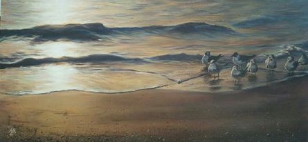 An older painting, done in acrylics, captures the gentle waves and the terns at Longboat Key, near where I lived when I first moved to Florida from Minnesota. To create the golden hour lighting, I used many layers of earthy and ochre shades and also contrasted with deep blues and purples. To texture the sand, spattering thin paint right from the brush was lots of fun! I hope you enjoy this serene scene.