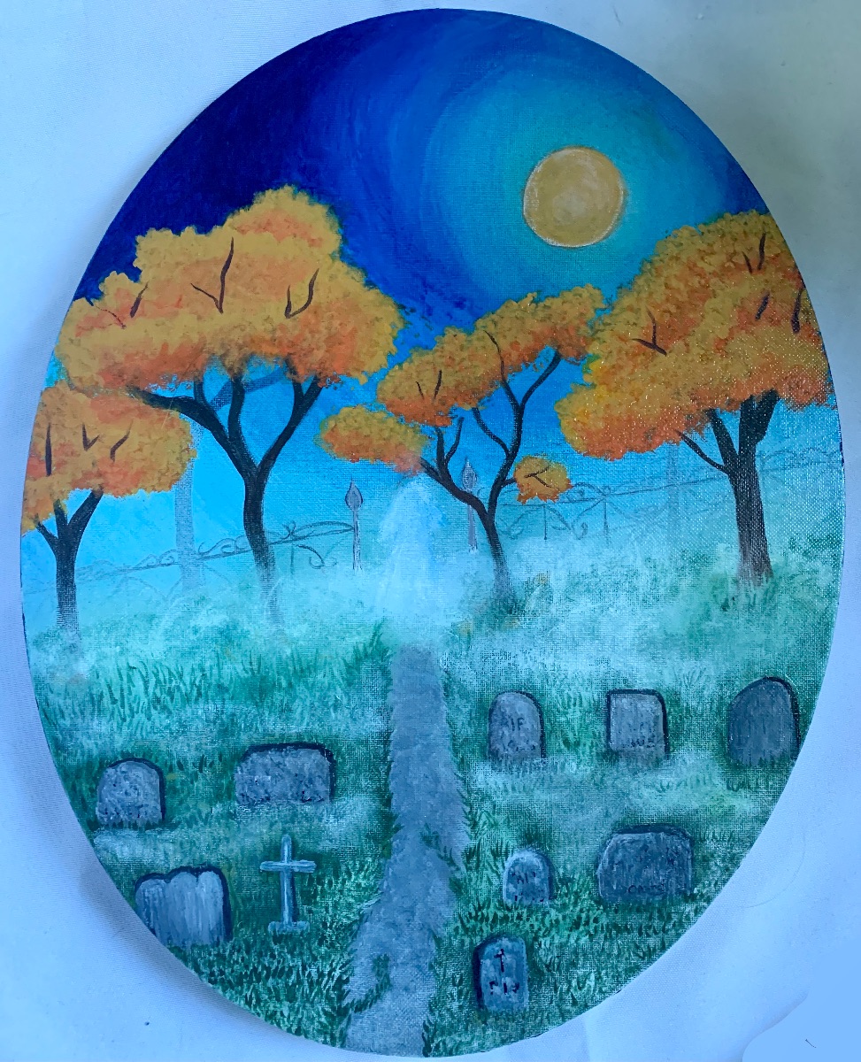 This piece depicts a morning sun shingling through fog overlooking bright autumn trees highlighted by the sun. Below the trees is a solemn cemetery with a path in the middle. If you look closely, you may see a shear sillouette of a woman in the fog. Is she a mourner leaving after a visit? Or is she a resident leaving to go visit family?