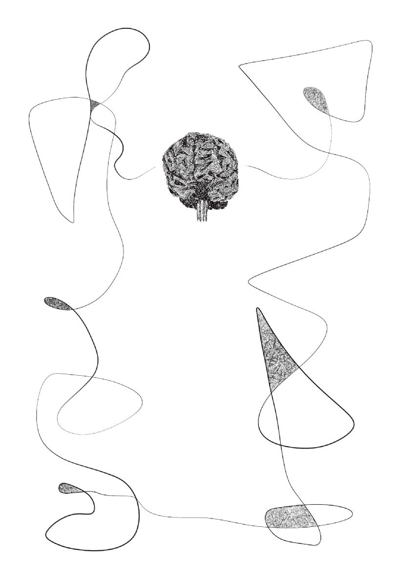 Part of my Triangle Period, a series of works consisting of only triangles. I began to incorporate two lines to indicate flow and movement of the main subject. Which in this case is a human brain consisting of 3,000 triangles.