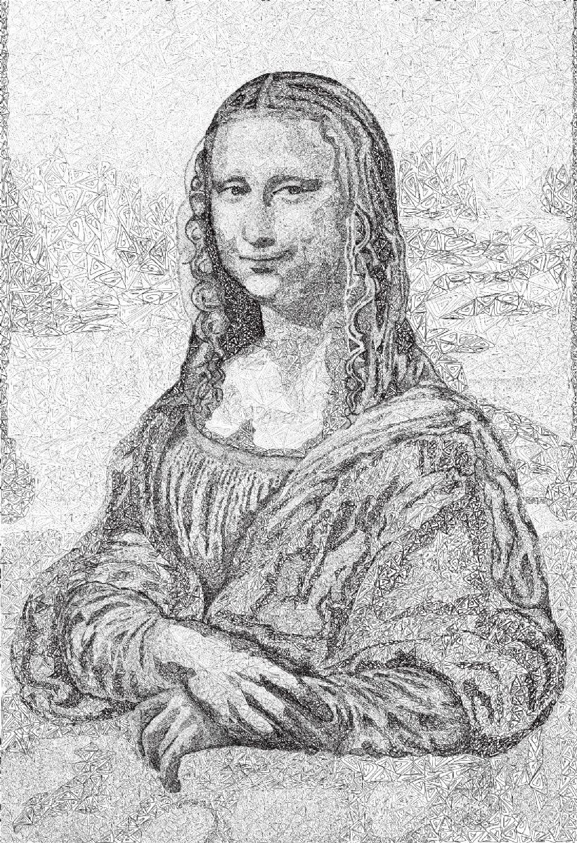 Utilizing Procreate's brush stroke counter tool, every triangle was automatically tallied along with the elapsed time to complete. It took just over 22 hours and 50,000 triangles to recreate Leonardo Da'Vinci's "Mona Lisa".