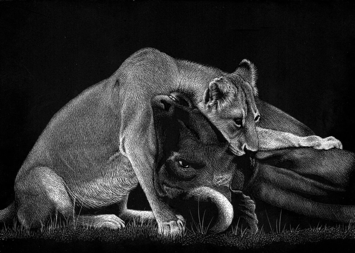 The artwork is created on Ampersand Scratchboard, this is a form of direct engraving where the artist scratches off dark ink to reveal a white layer beneath. Scratchboard refers to both a fine-art medium, and an illustrative technique using sharp knives and tools for engraving into a thin layer of white China clay that is coated with dark, often black India ink. When scratched, exposes the white surface beneath. Scratchboard can be used to yield highly detailed, precise and evenly textured artwork.