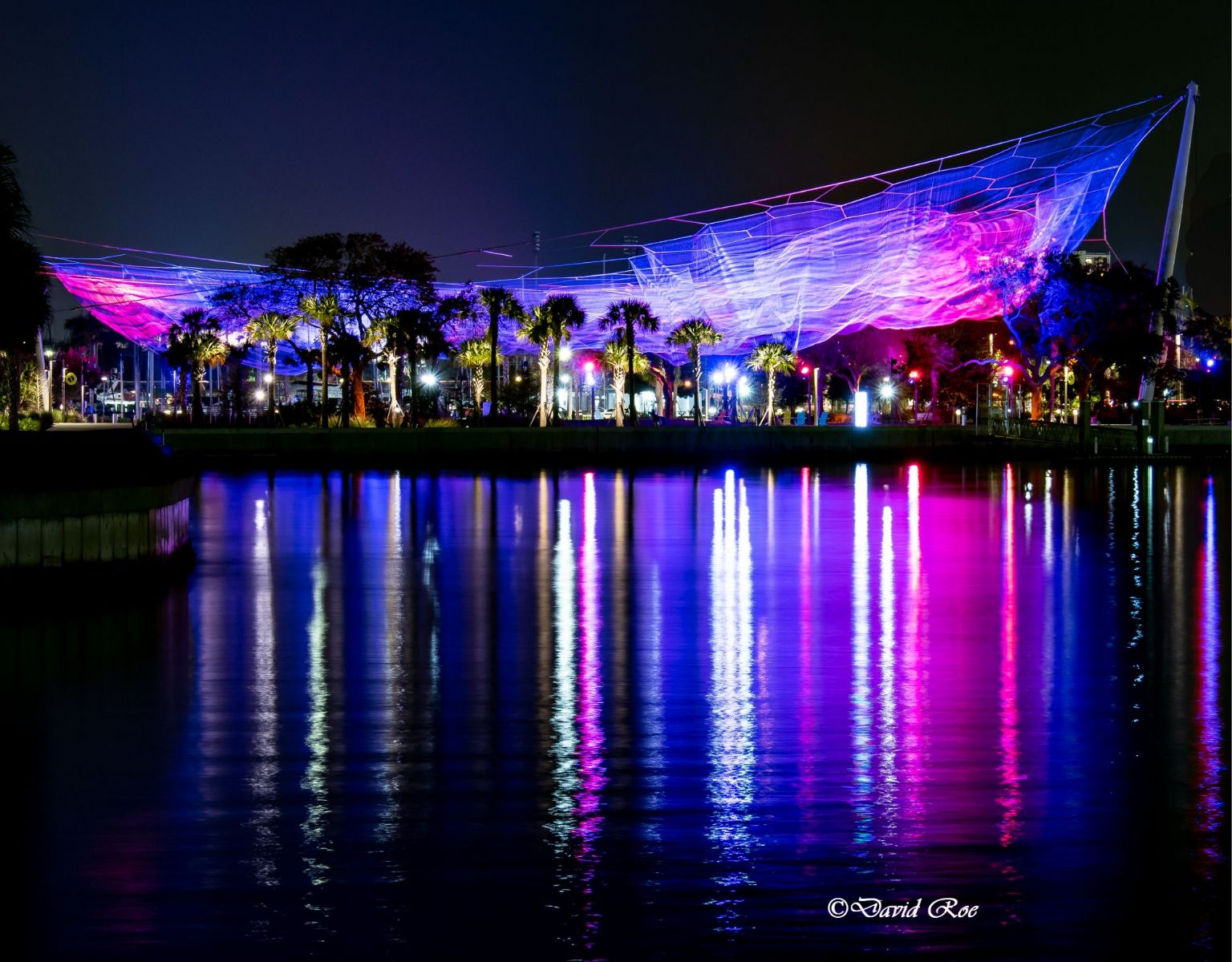 The new pier in St Pete is a beautiful gift. This is the blue canopy that's part of the pier. It was shot from across the North Yacht Basin at midnight. I was in Vinoy Park. Looking across the park I was impressed with the beauty of how the blue canopy and its refection stood out at night.