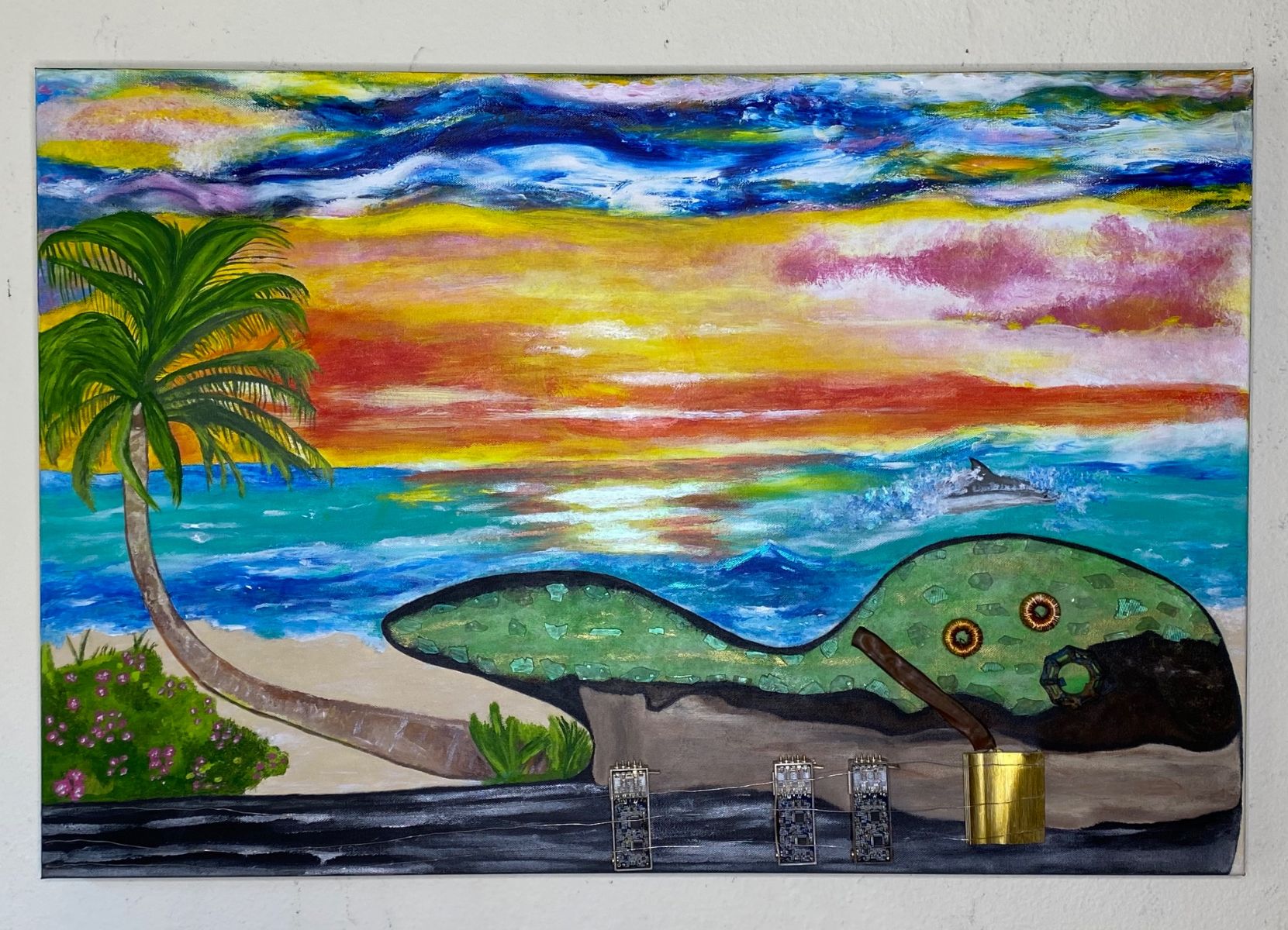 When you live live in paradise, why go anywhere else? Growing up in Florida has had a huge impact in my life. Florida creates the perfect vibe between the concerts, music festivals, the beaches, sunrises and sunsets. I love going to the recycling center to find pieces I can reuse. The guitar (Ibanez) on the beach has recycled materials. Copper, with metal parts, circuits and glass.