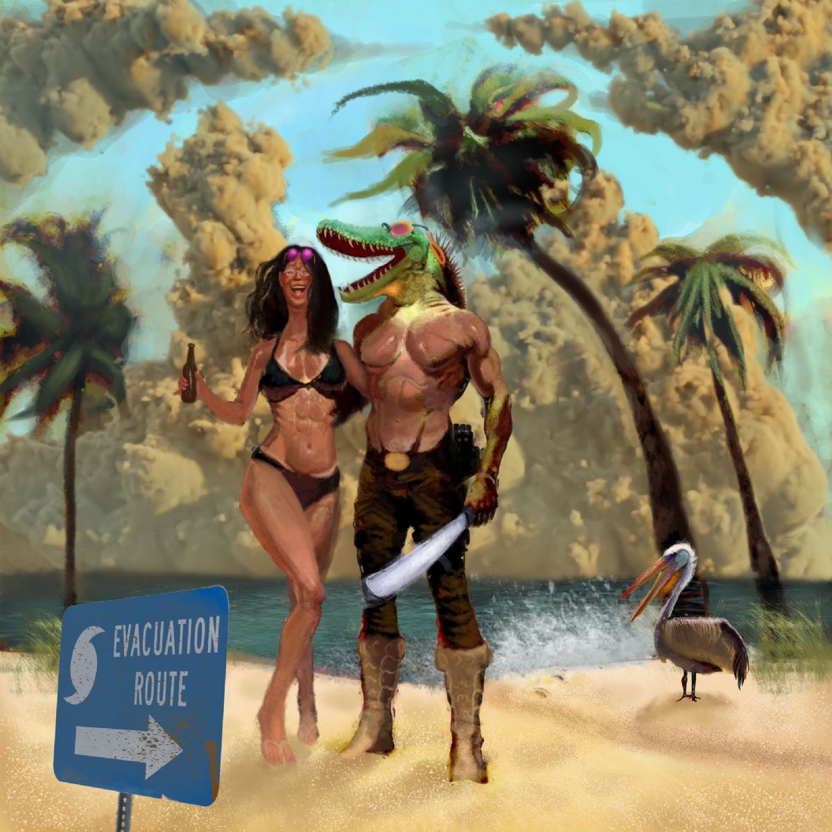 "FLORIDAMAN" is a fun illustrative caricature of Florida. Florida Man is part gator, part iguana, all man! Eccentric, untameable, and has a machete for some reason . . . maybe he works in landscaping!