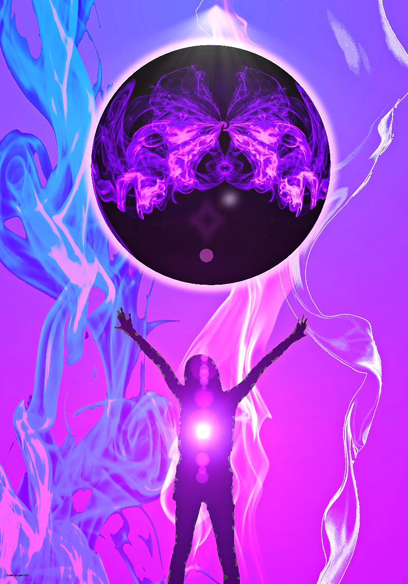 3D black sphere with purplish smoke inside floats above a shadow of female human. A lens flare in pinkish hue glows in her body. Smoke, fire, and water can be seen behind the person and the 3D sphere in transparency on gradient purple from top down to pink color at the bottom.