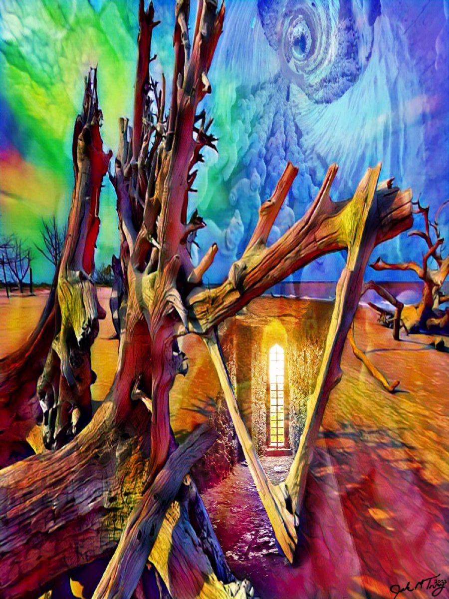 Portal shows how in an instant our minds can transport our consciousness to different environments and/or experiences. Memories of personal or vicarious experiences flash in our minds in dreams or daydreams to create a personal view of the world. This work is crafted from my digital photos from Driftwood Beach, Jekyll Island, Ga, Emperor Qinshihuang's Mausoleum Site Museum,Xi'An ,China, and Blarney Castle near Cork, Ireland.