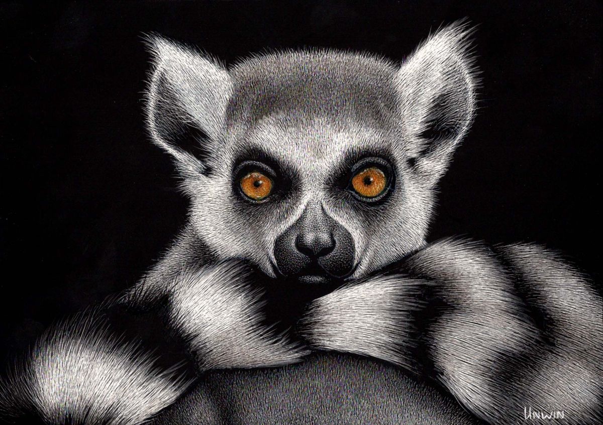 Lemur Love | Scratchboard and watercolor, 7" x 5" x 0"