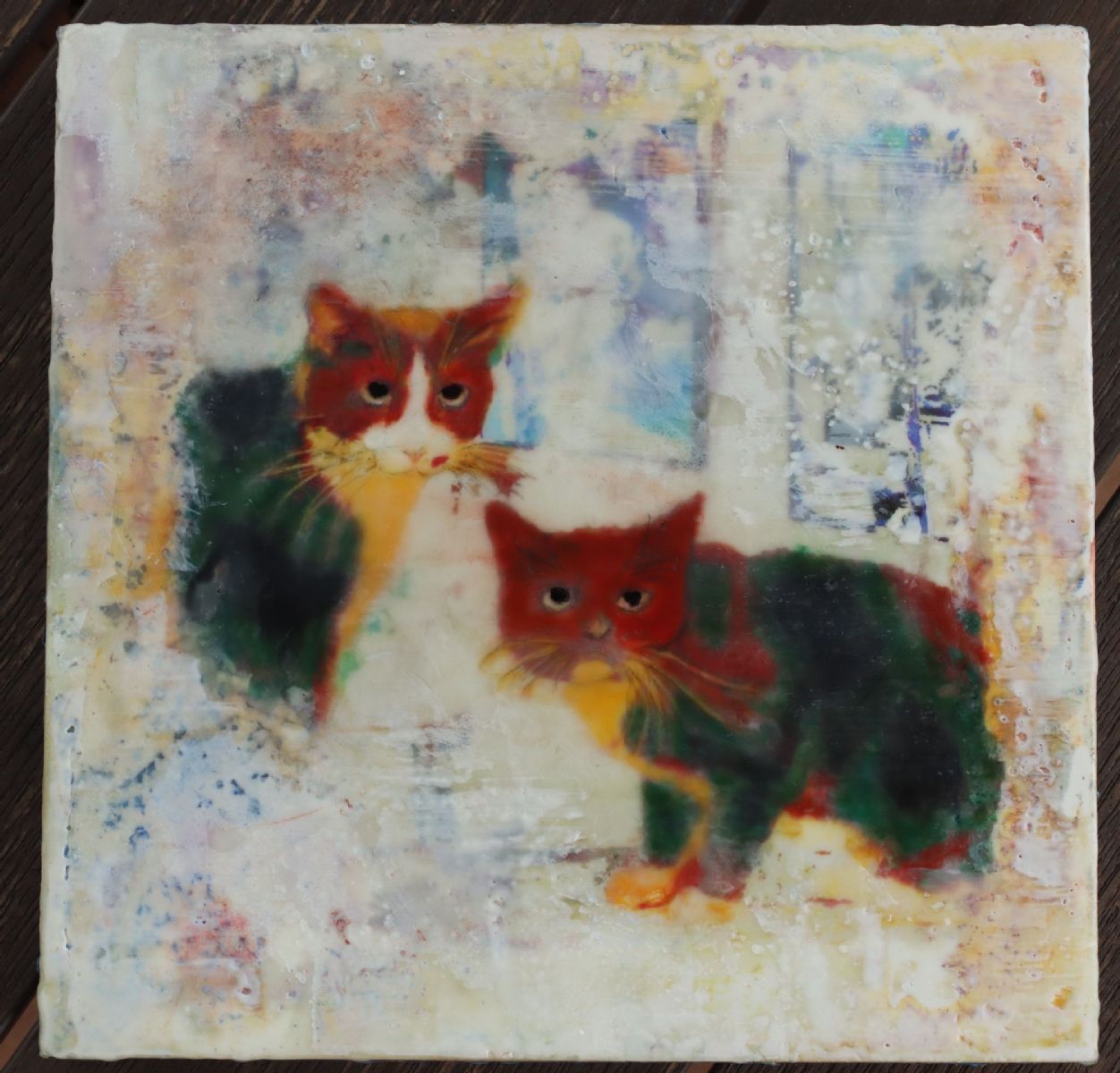 This art piece was created by starting with a birch board then covering it with layers of molten beeswax and pigments. The photo of my cats was manipulated with a digital program and then printed on tissue paper. The tissue image was embedded into the wax with a heat gun. Then layers of melted wax and pigments were repeatedly added and scraped back to get the final surface, which was sealed with a blow torch. Digital manipulation of the original photo was key to laying the foundation and getting the desired effect.
