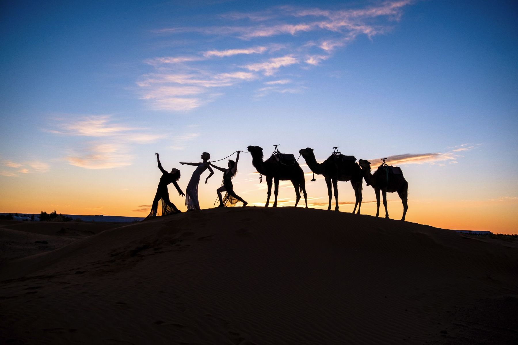 The artwork presents a striking silhouette scene set against a beautiful morning sky with varying shades of blue, orange, and yellow. The composition captures a group of figures, some dynamic and others more static, along with camels standing on the crest of a sand dune. The human figures are positioned in expressive poses conveying movement and emotion, while the camels are portrayed in a calm, stable manner, offering a stark contrast to the human subjects. The sense of depth is emphasized by the smooth lines of the dunes, which complement the sky's natural gradation of colors.