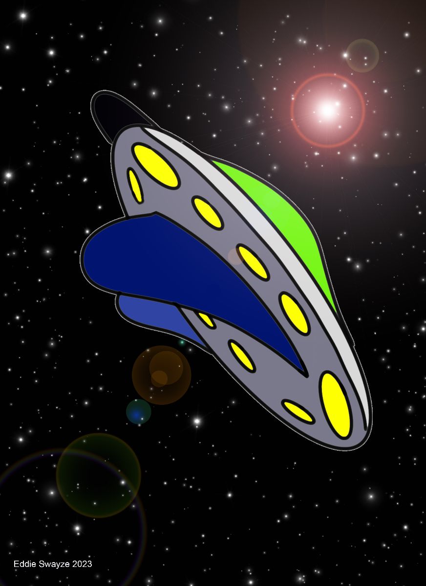 Cartoon of an alien spacecraft, surrounded by stars with one bright lens flare at upper right of the whole image.