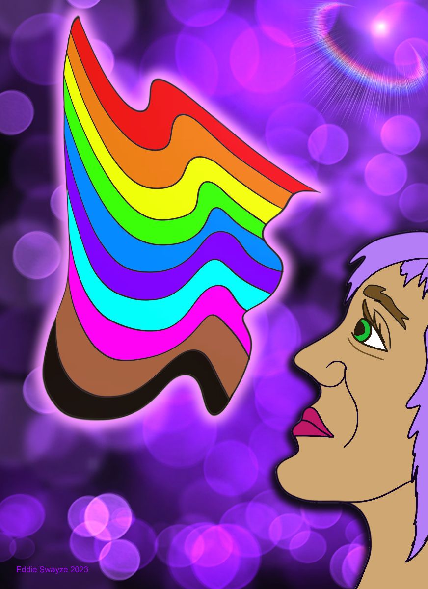 Cartoon of a person with purple hair looking up at a cartoon rainbow flag, purple bokehs and a lens flare with rainbow radiance is the background.