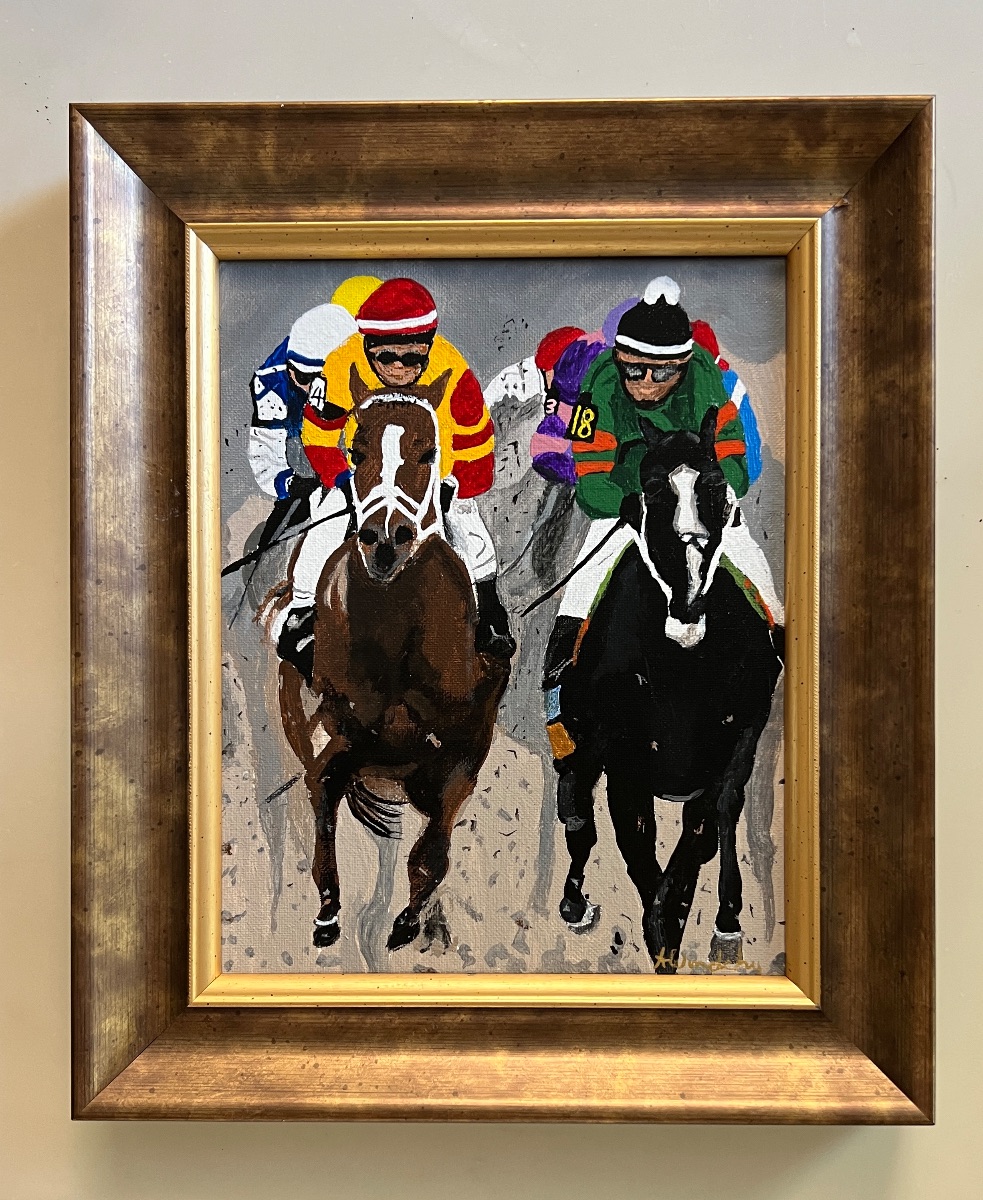 This is a tribute to the Kentucky Derby. It is an acrylic on an 8" x10" canvas. Framed it measures 12" x 14". It is available at Kore Art Gallery in Louisville, KY.