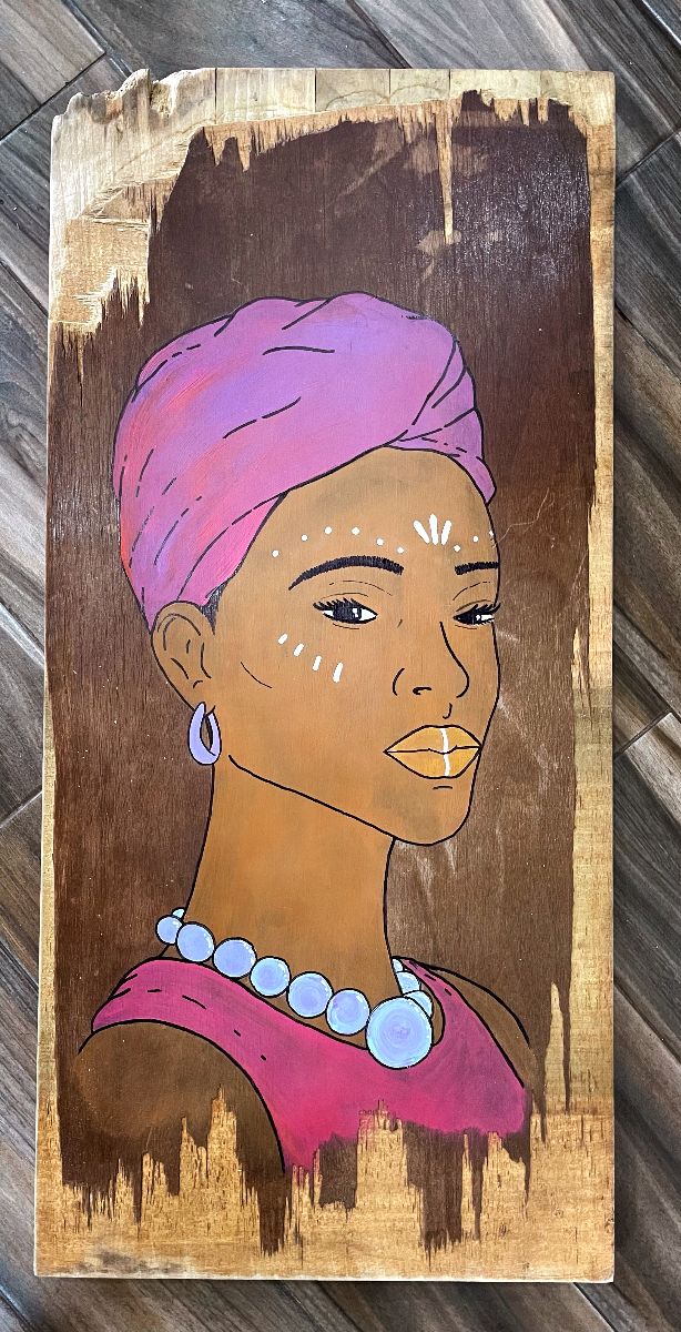 "Jameela" employs symbolism to convey contrasting themes of racial injustice and resilience. The decaying wood panel represents the atrocities of racial discrimination, while the portrait of a young African woman symbolizes unwavering resilience and enduring beauty. The artwork juxtaposes decay and strength, inviting reflection on our culture's past ugliness and celebrating the indomitable spirit in the face of adversity. It serves as a reminder to confront history, acknowledge its consequences, and strive for a future of equality and justice.