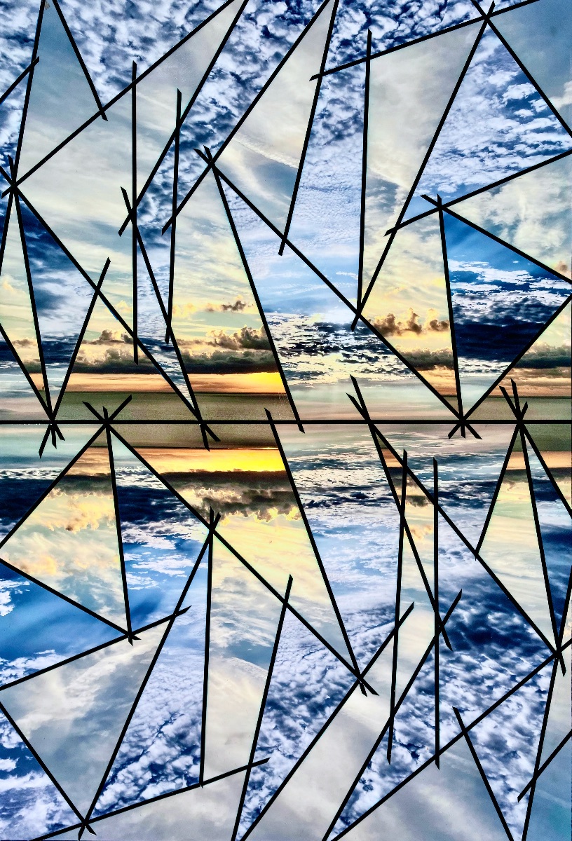 The sky is broken, the fractured pieces transformed into a piece of stained glass, the effect enhanced by printing on clear acrylic. This hallucinogenic stained glass window was make using photos of the Florida sky over Tampa Bay and the Gulf of Mexico.