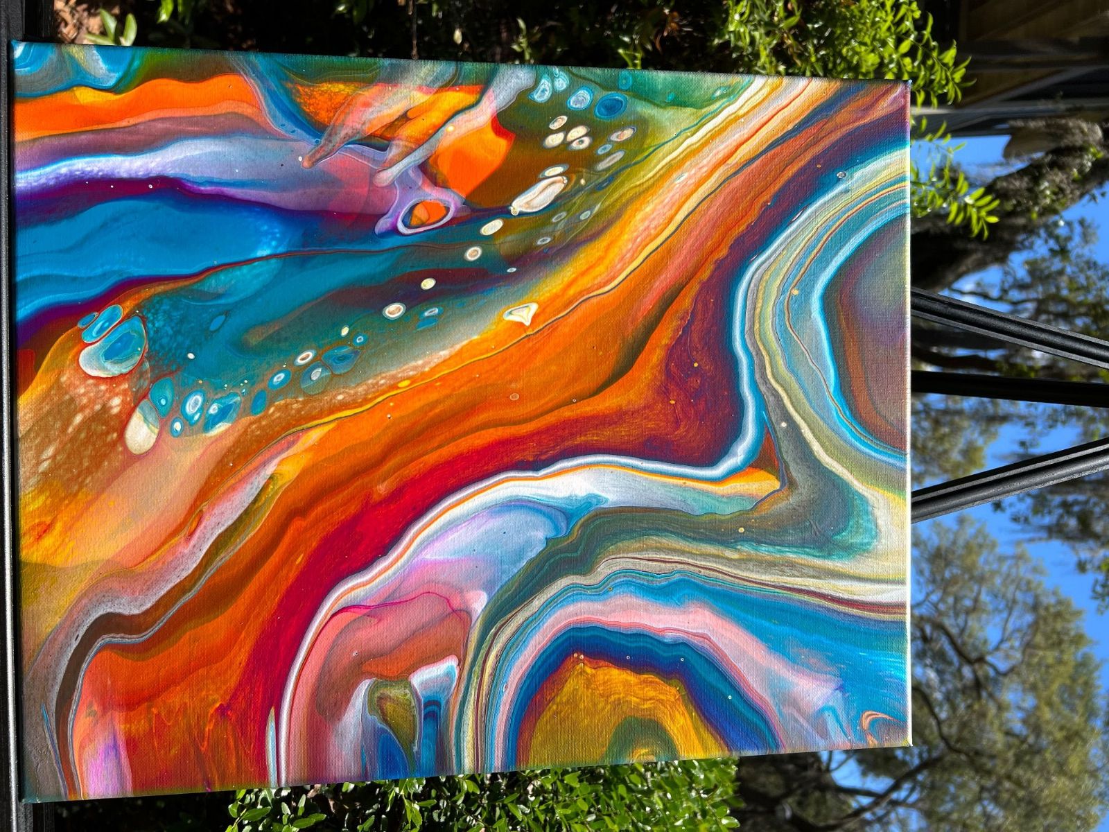 A flip cup pour of layered paint and a piece that cannot be duplicated. A one of a kind. Layered liquid paint hand mixed, choosing colors that would work well together with a hint of gold.