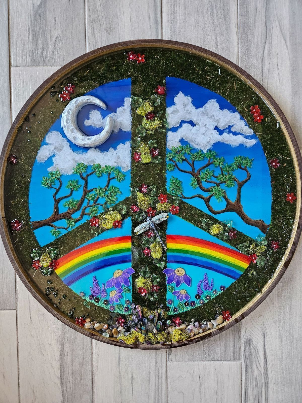 The crescent moon sits high in the clear blue sky as the clouds gather their strength. The flowers turn their faces upwards, and the trees position their leaves in anticipation of the spring storms. The rains come, cleansing the earth and where the water touches the light...rainbows. THIS is Peace.